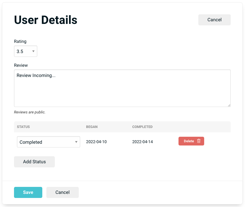 Status – Status can be used to track your progress reading, watching, listening, or playing through a specific item. We offer 4 statuses: “Not Begun”, “In Progress”, “Completed”, and “Abandoned”. You can track the start and end dates where applicable and track as many statuses per item as needed.