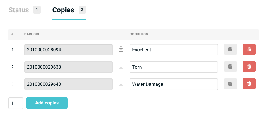 Add Copy – You can add multiple copies by changing the number of copies to add and clicking on the “Add copies” button – with a limit of 500 total copies per item. From here you can also write a note specific to each copy.