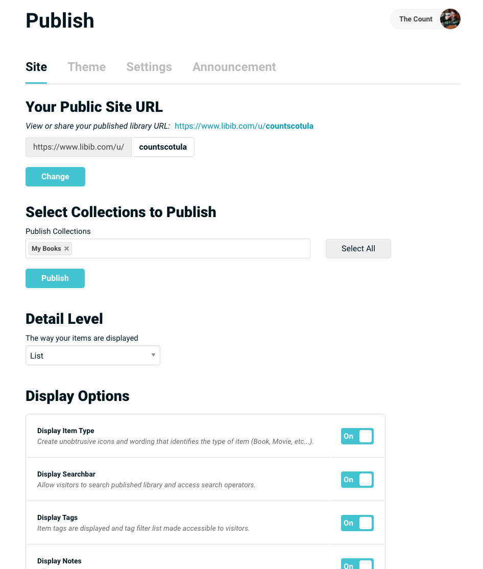 Detail level lets you choose how the items will be shown to the public. These levels of detail mirror the options available on your own collections. You can choose summary, list, or cover.